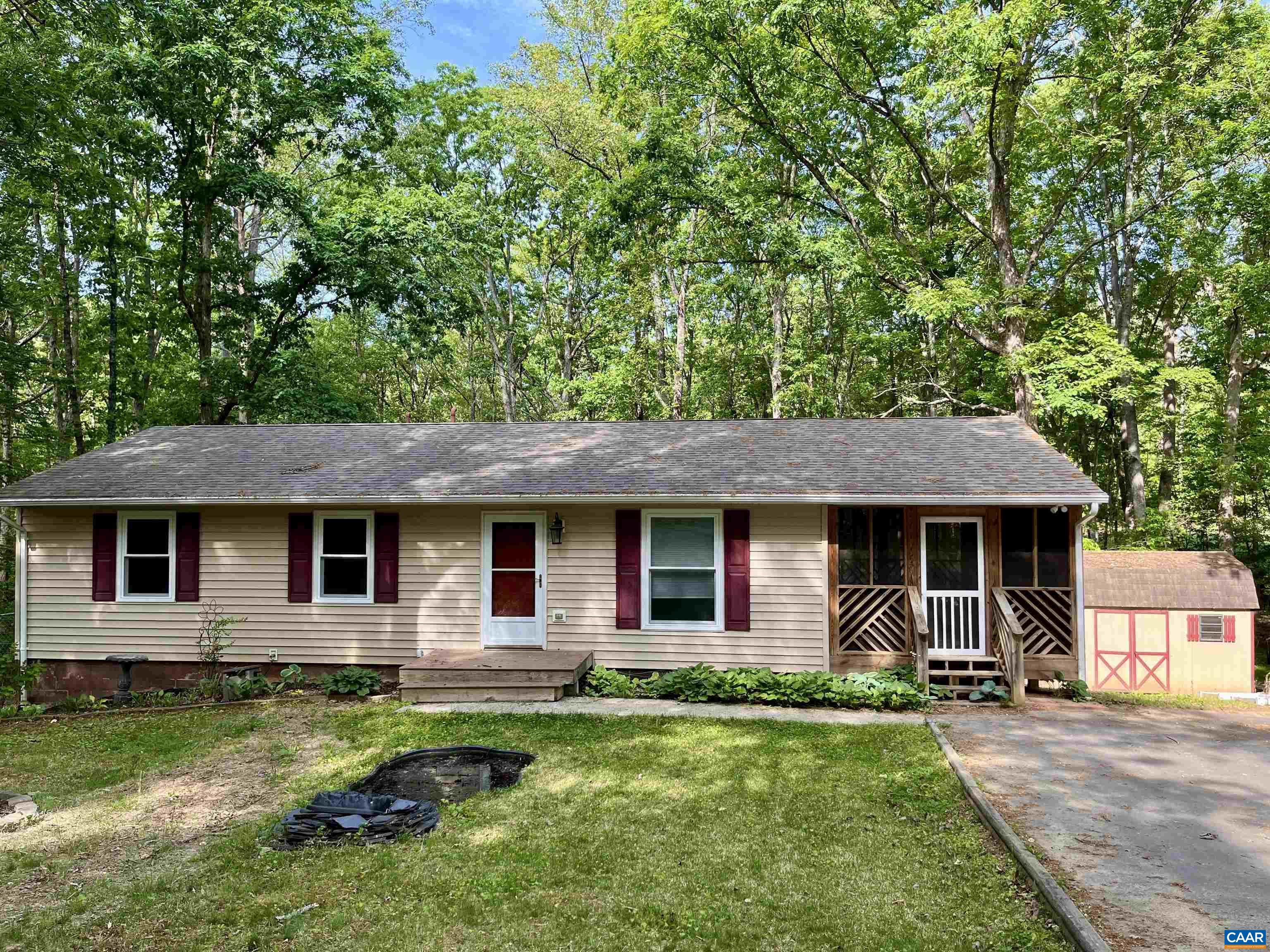 Conveniently Located with Tranquil Privacy! Nestled just off the road for ultimate peace and serenity, this charming ranch home offers easy access to both Interstate 64 and Route 250, making commuting to Charlottesville and Zion Crossroads a breeze. Inside, you’ll appreciate the warmth of hardwood floors throughout the living room, kitchen, hallway, and primary bedroom, while both bathrooms feature stylish tile. The spacious basement is perfect for entertaining, with a portion left unfinished to provide ample storage space. Enjoy the serene surroundings from the screened-in porch—ideal for sipping your morning coffee or dining outdoors in the evening. The property also boasts a partially paved driveway and a fenced backyard. Experience the best of both convenience and tranquility in this delightful home! Roof and Screened-In Porch were done in 2016. New windows in 2022. The driveway was paved in 2018.