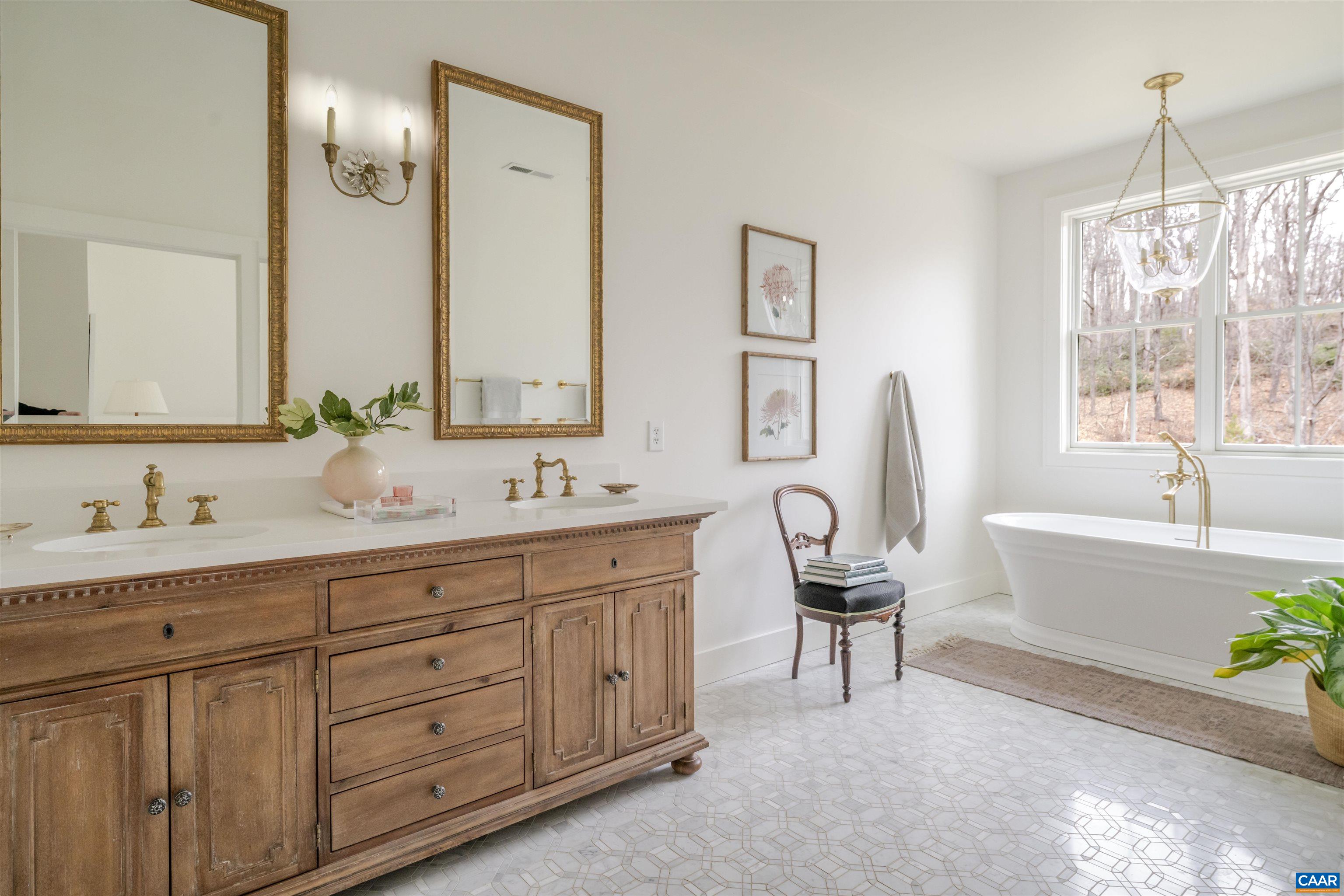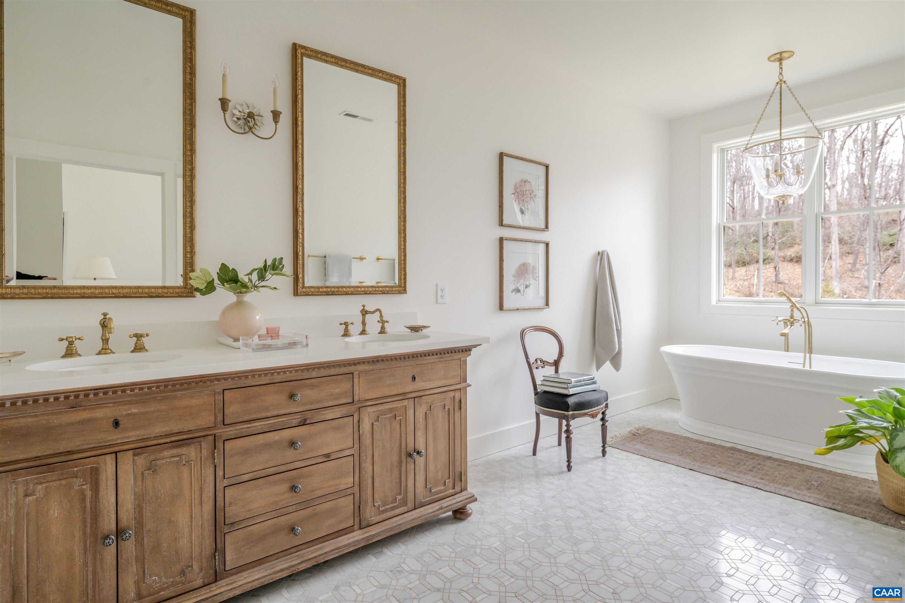 Completed in 2022, this custom residence occupies one of Bundoran Farm's most private and serene pockets, framing sweeping easterly views of pasture and mountain winter views. The thoughtfully designed home offers a main level that balances openness with privacy. An expertly designed kitchen anchored by an Aga induction range and a one-of-a-kind Carrara marble farmhouse sink opens to a light-filled dining room and living room with wood stove and oversized Pella Lifestyle Series windows. The primary, in a separate wing, offers a quiet retreat, with its large soaking tub and access to the deep porch with quintessential North Garden views towards the East. Three additional en-suite bedrooms provide ample space for family or guests. The high-ceilinged terrace level delivers two offices, a bedroom, two full baths, and a large, unfinished, sun-drenched, bonus room ideal for a family room or gym. Outside, a pool and courtyard anchor the front of the home; a deep side porch captures Bundoran's protected viewshed. Zero road noise, and 20 minutes from town — with 14+ miles of private trails that rival a National Park. Bundoran Farm homes rarely come to market. This is a rare one.